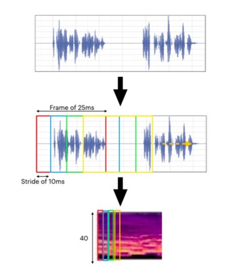 Raw audio is split into overlapping 25ms frames, moving forward (stride) 10ms at a time