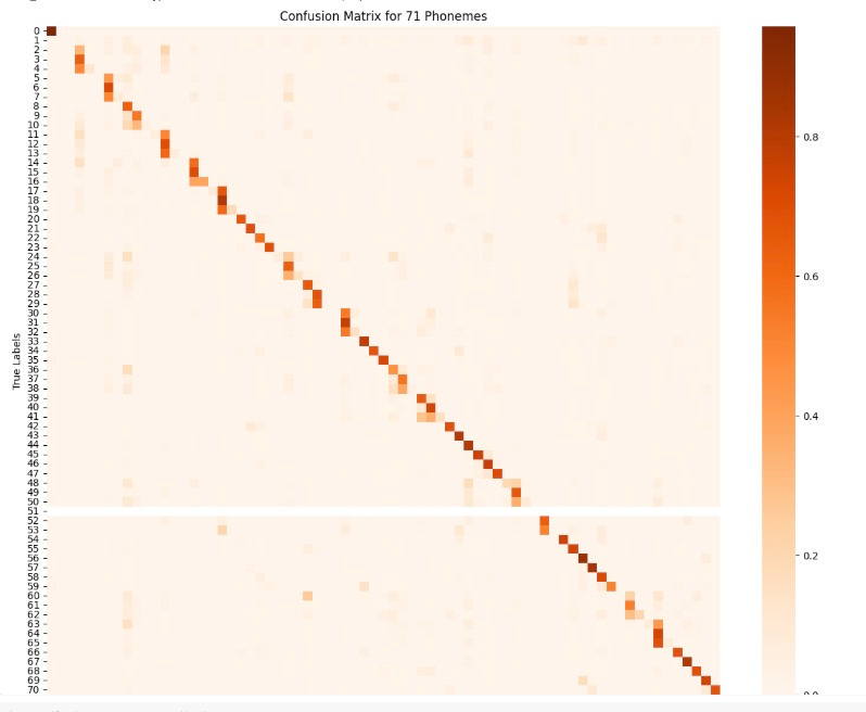 A test accuracy of 74% in distinguishing 71 phonemes reflects reasonable performance, particularly given the subtle differences in natural speech. These findings match known patterns of speech perception, where errors occur between similar sounds rather than at random. This reflects how people naturally process and distinguish speech sounds.