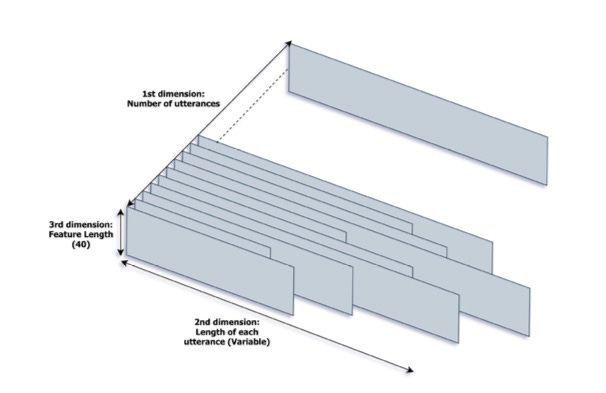 In summary, each audio clip is represented as a 2-dimensional array (num_frames × 40 features, which expands to 3,400 features with context). The training dataset comprises over 14,500 utterances, totaling approximately 18 million frames.