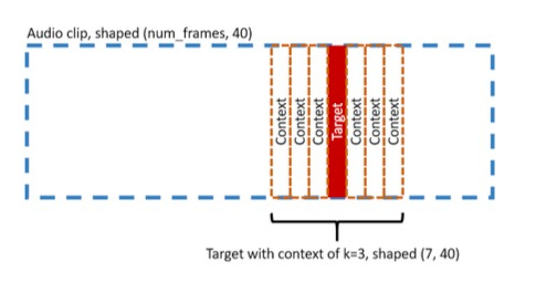 This visual below illustrates a target frame with a context k=3 (3*2 + 1 = 7 frames)